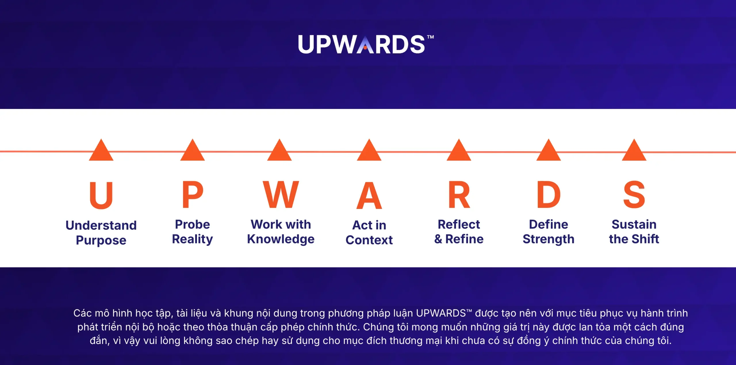 Khác với một phương pháp thông thường, UPWARDS™ được xây dựng trên hàng thập kỷ quan sát và đúc kết từ các nhà lãnh đạo cấp cao, kết hợp với nghiên cứu quốc tế và thực tiễn doanh nghiệp Việt.